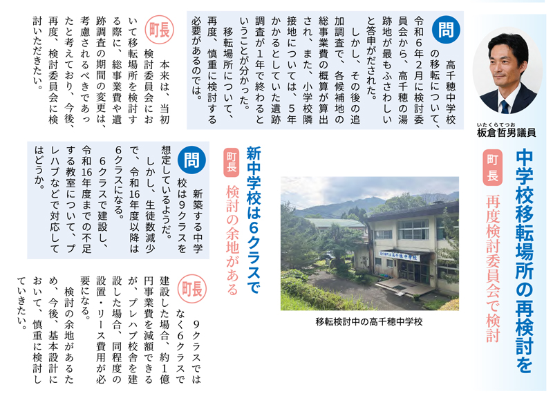 今回の一般質問では、高千穂中学校の移転新築について、①移転場所の再検討、②学級数の考え方、③現中学校の安全対策という3点を中心に問題提起を行いました。